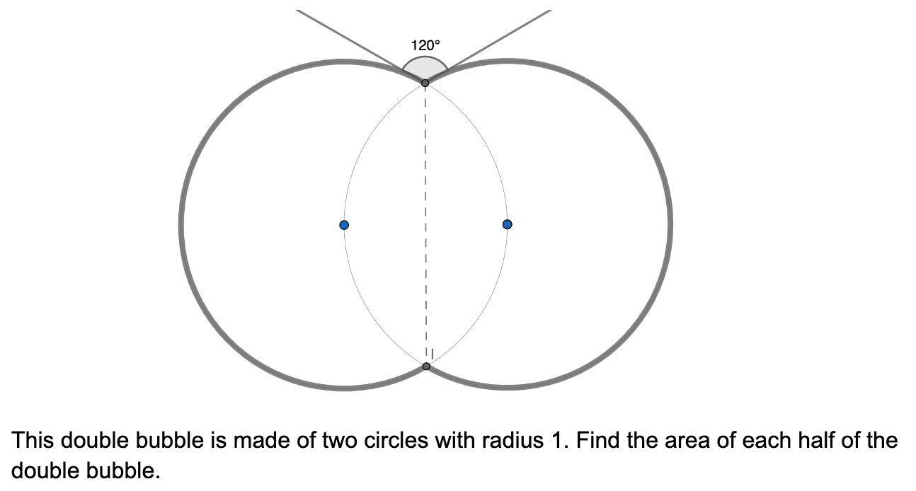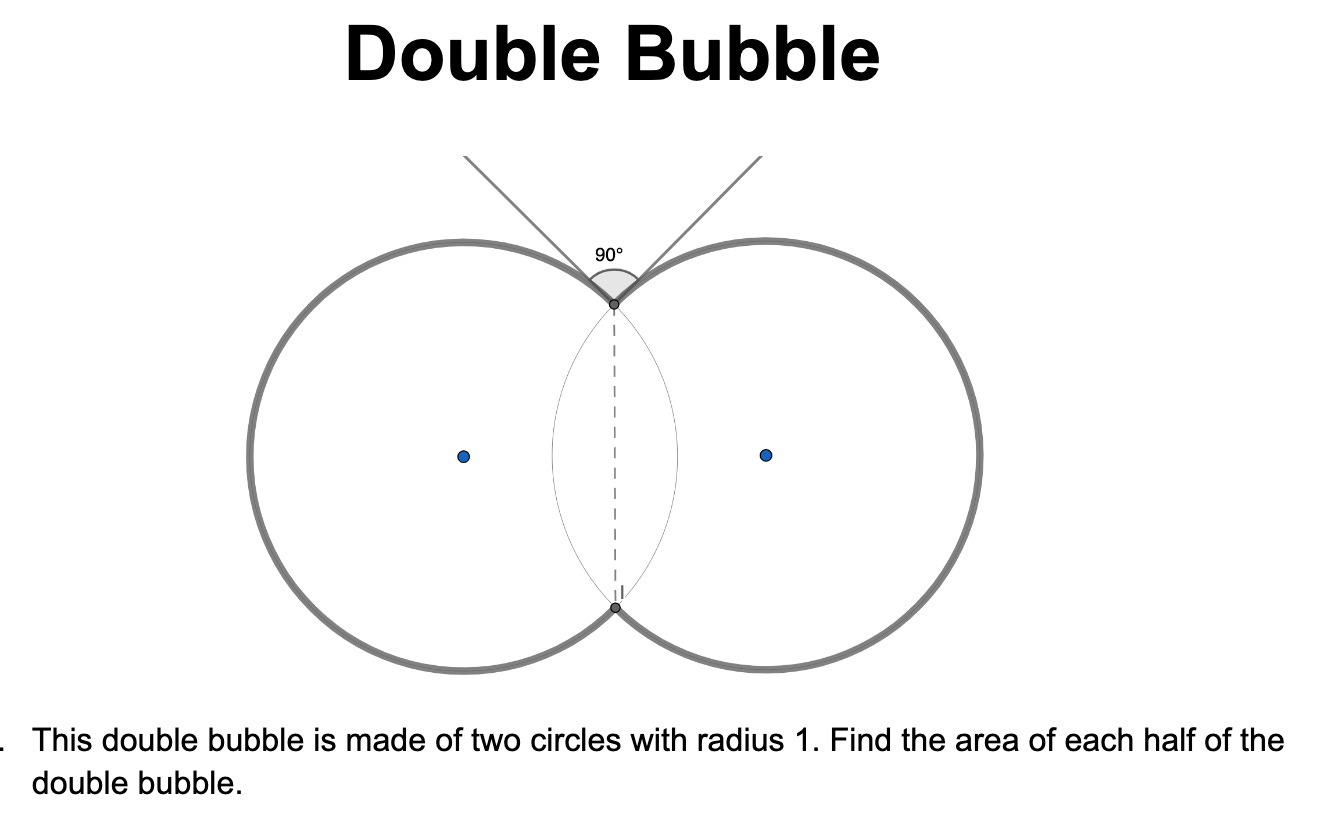 Whatever—I’m still into these 2D double bubbles. As a little extra assignment, I asked students to find the area of a few of these double bubbles, which is not necessarily easy for kids.