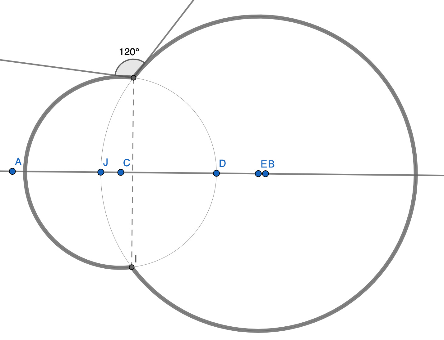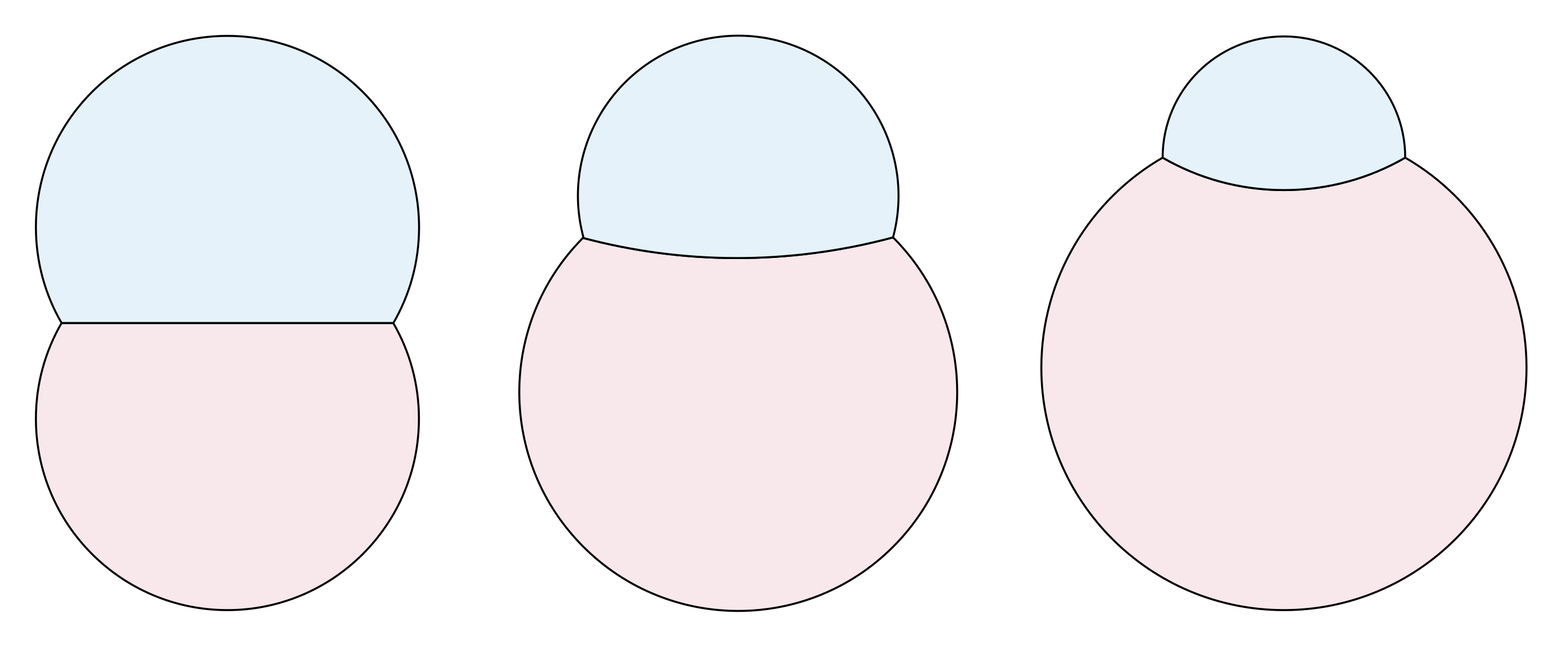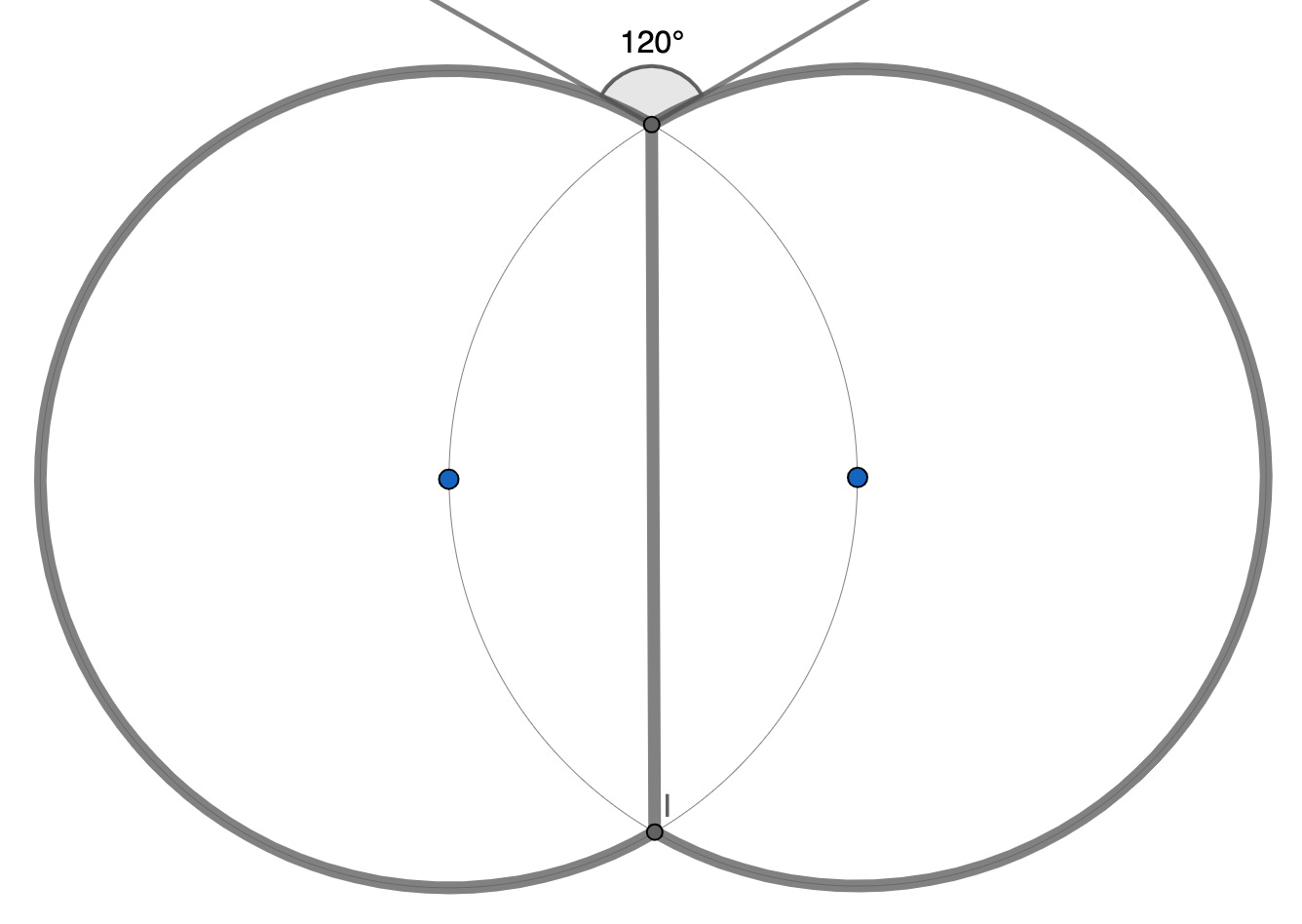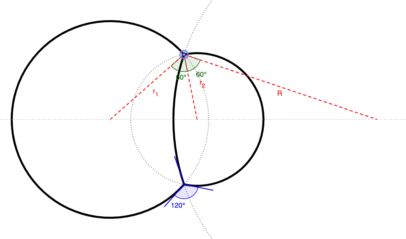 But the problem is (apparently) that to minimize the perimeter we need THREE angles of 120 degrees. When the circles aren’t the same size, a dashed line straight down doesn’t cut the remaining 240 degrees in half evenly. We need a third arc to connect those points and divide the areas.