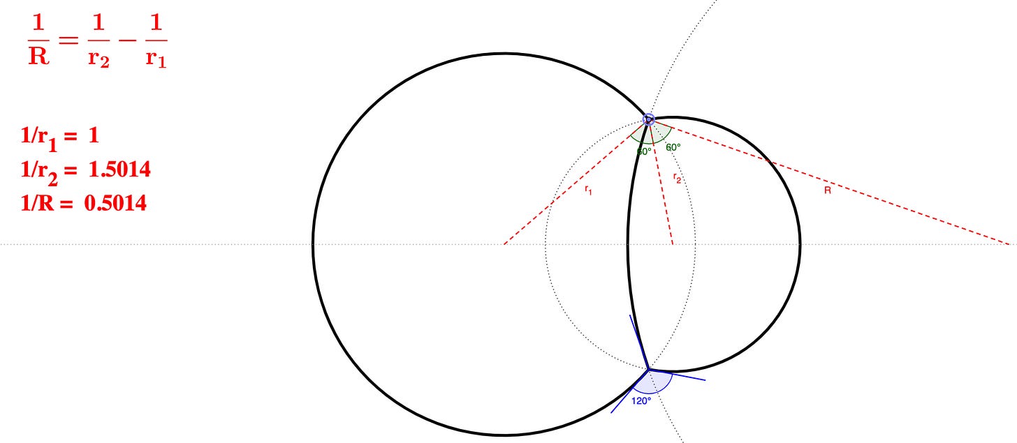 And there’s one more fun thing, which is that there are three circular arcs in the double bubble, all with their own radius. There’s the two bubbly-looking circles, plus the part of a circle between them. Is there any connection between all these radii?
