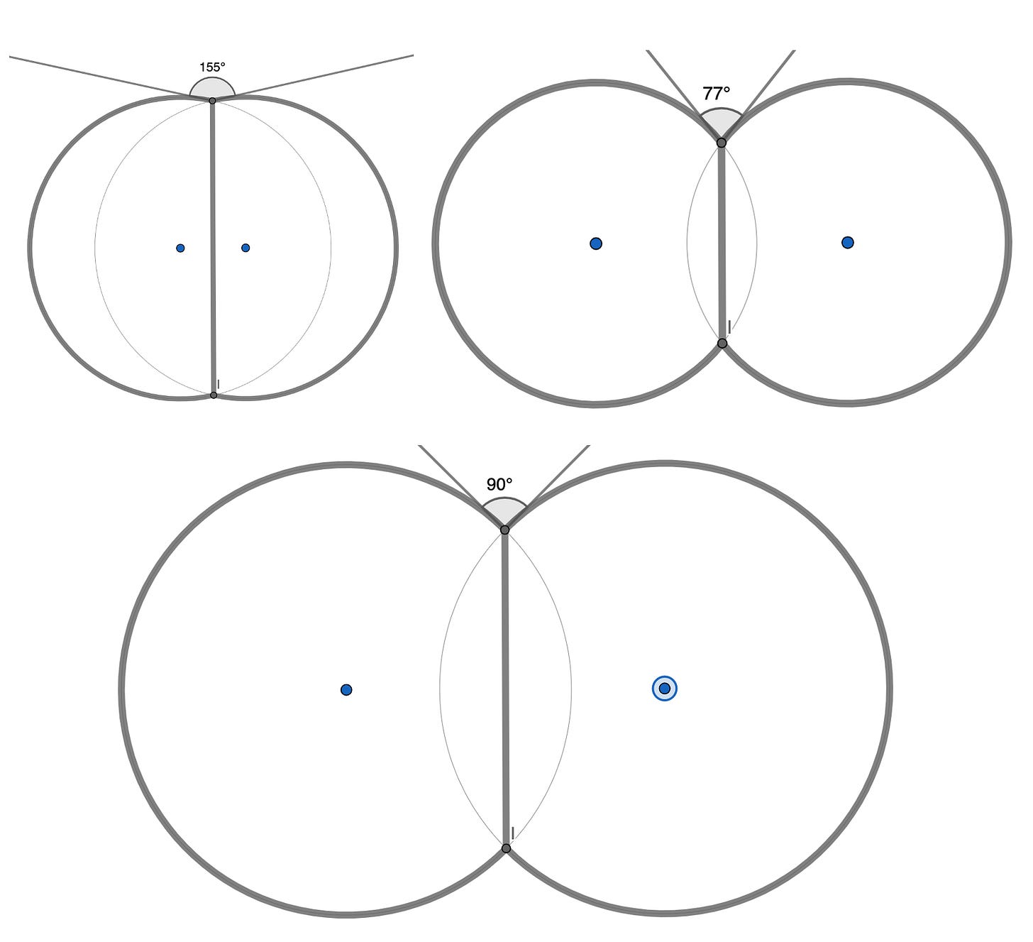 (Small print: we’re drawing tangents to the circles at the point of intersection. Play with it in geogebra here. But that’s cool—we can find angles between curves now!)