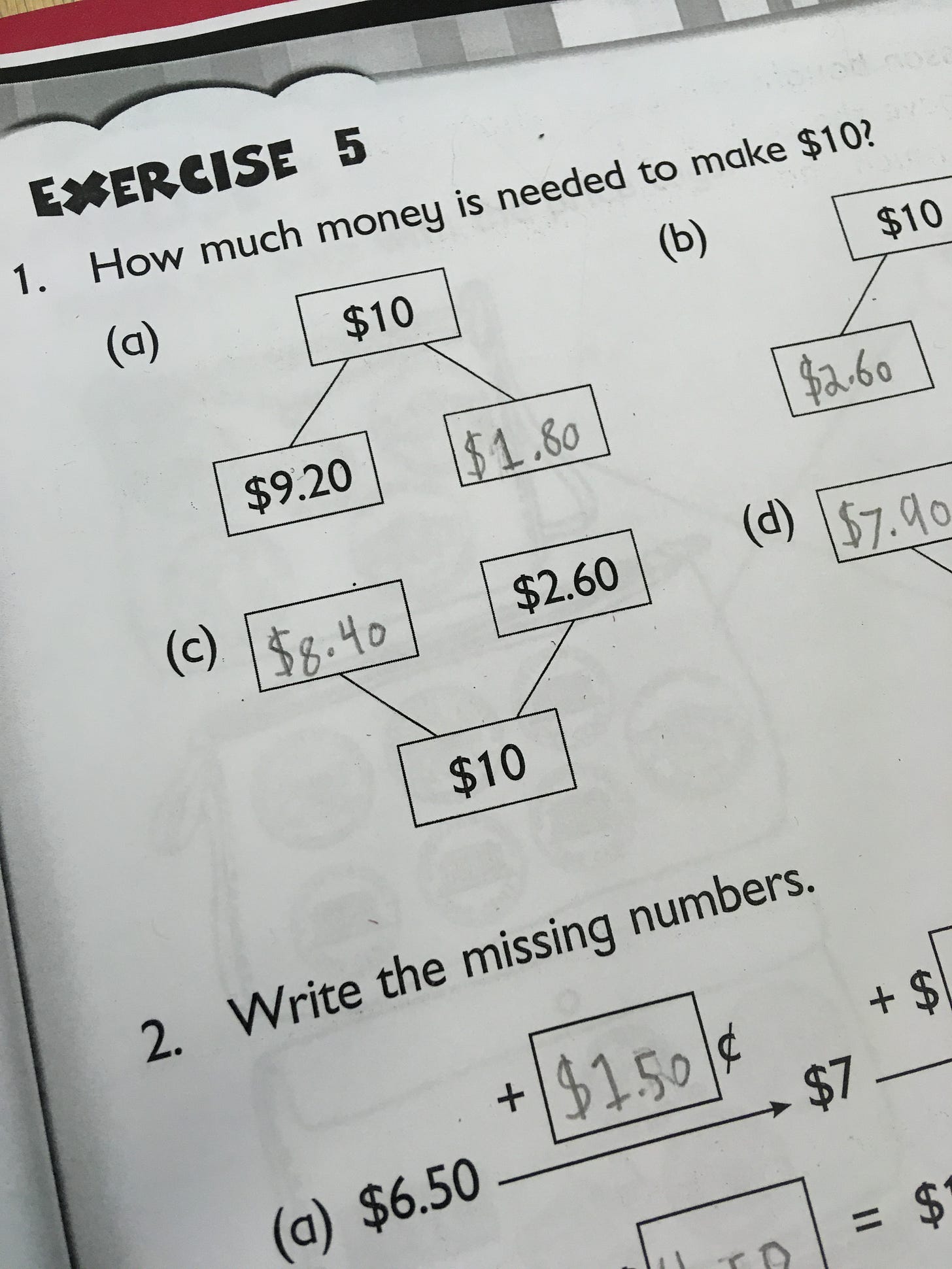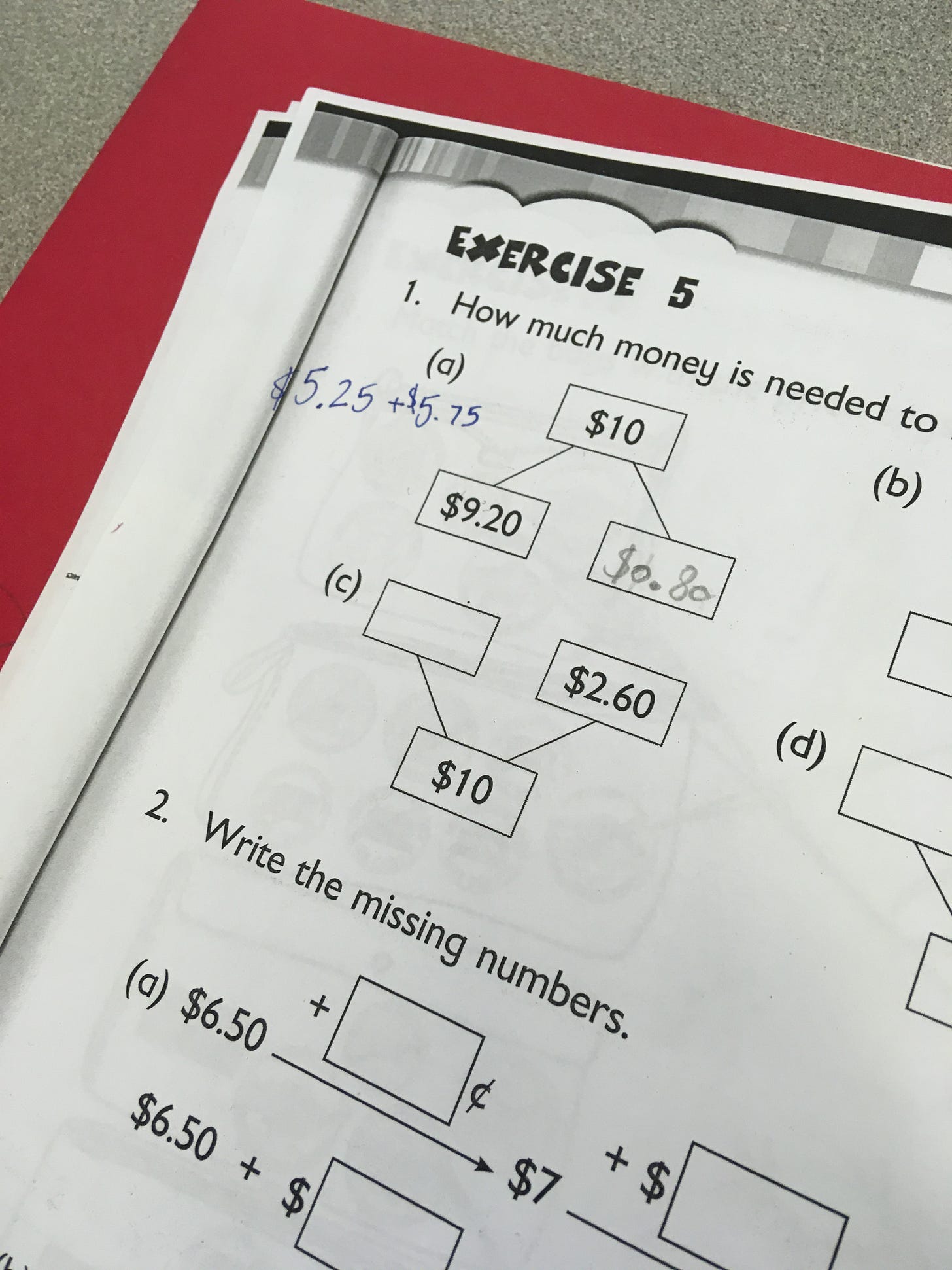 One student, call her Violet, showed me her page and asked me if it was correct. I wasn’t sure what to say, so I paused and gathered my thoughts. She had said that $9.20 and $1.80 make $10.00.